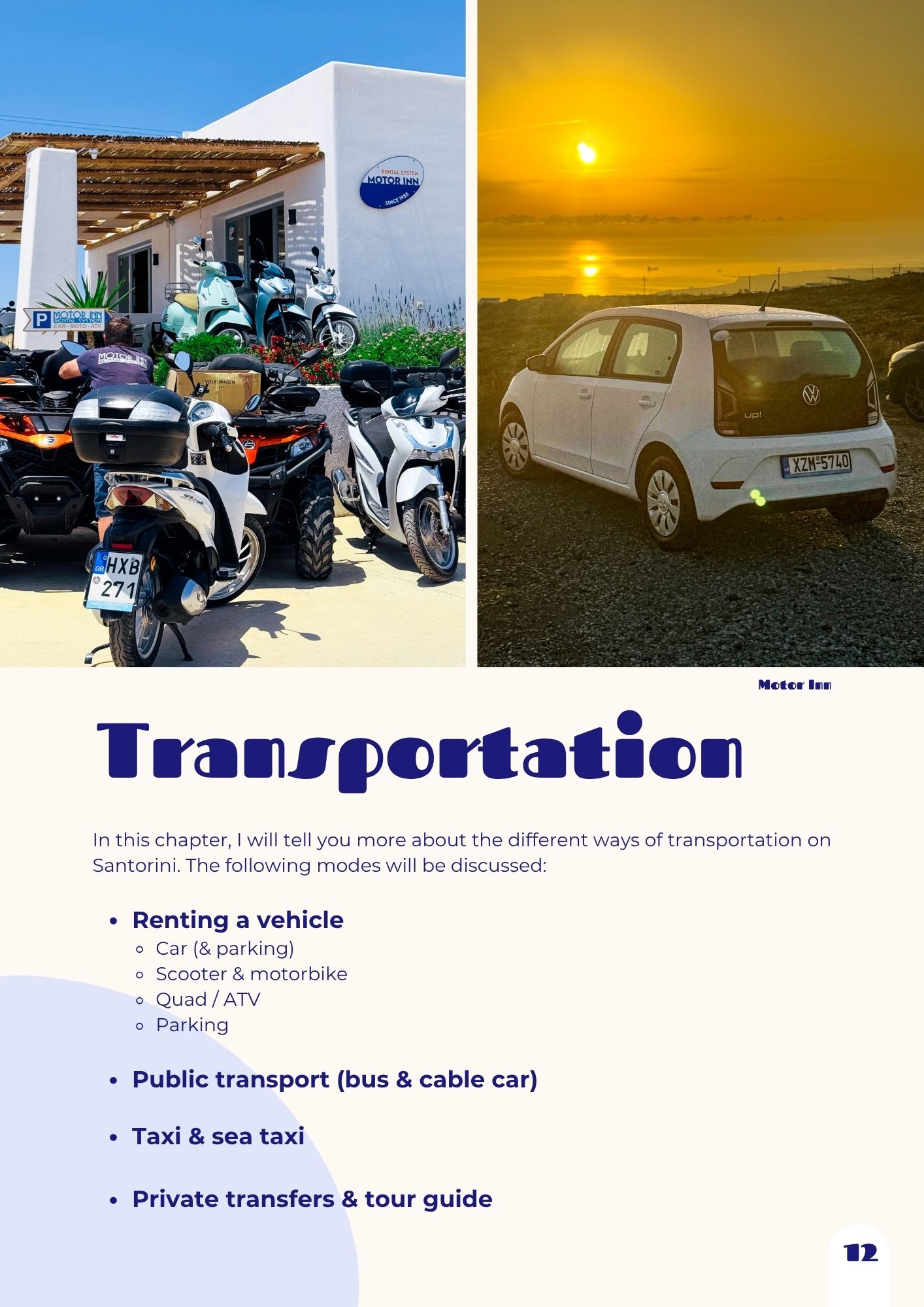 • Transportation on Santorini (renting a vehicle, public transport and (water) taxi, private transfer & tour guides)